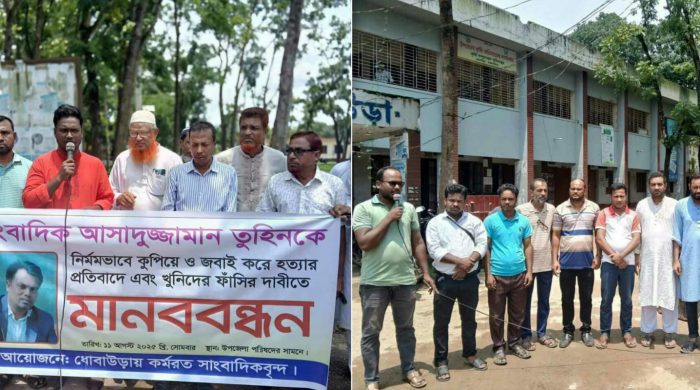 ফরহাদ মিয়া, হালুয়াঘাট-ধোবাউড়া প্রতিনিধি। ময়মনসিংহের হালুয়াঘাট-ধোবাউড়ায়, গাজীপুরে সাংবাদিক আসাদুজ্জামান তুহিন’কে নির্মমভাবে হত্যা করা হয়েছে, হত্যাকারীদের দৃষ্টান্তমূলক বিচার ও সারা দেশে রাষ্ট্রীয় নিরাপত্তা জোরদারের দাবিতে। (১০’ই আগস্ট ২০২৫) রবিবার, দুপুরে ধোবাউড়া